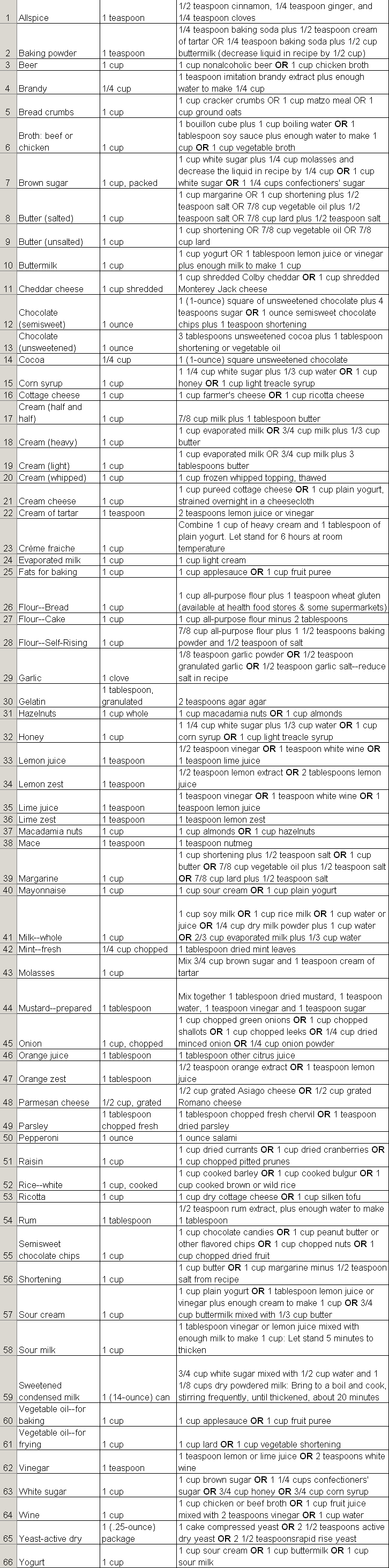 One of the worst things is not being able to bake something because you can’t find an ingredient or you just don’t have the time to run out to the store. Well, thanks to allrecipes.com and my variety of cookbooks, I’ve put together an ever-growing list of common ingredient substitutions that I’ve found helpful in my baking years.
