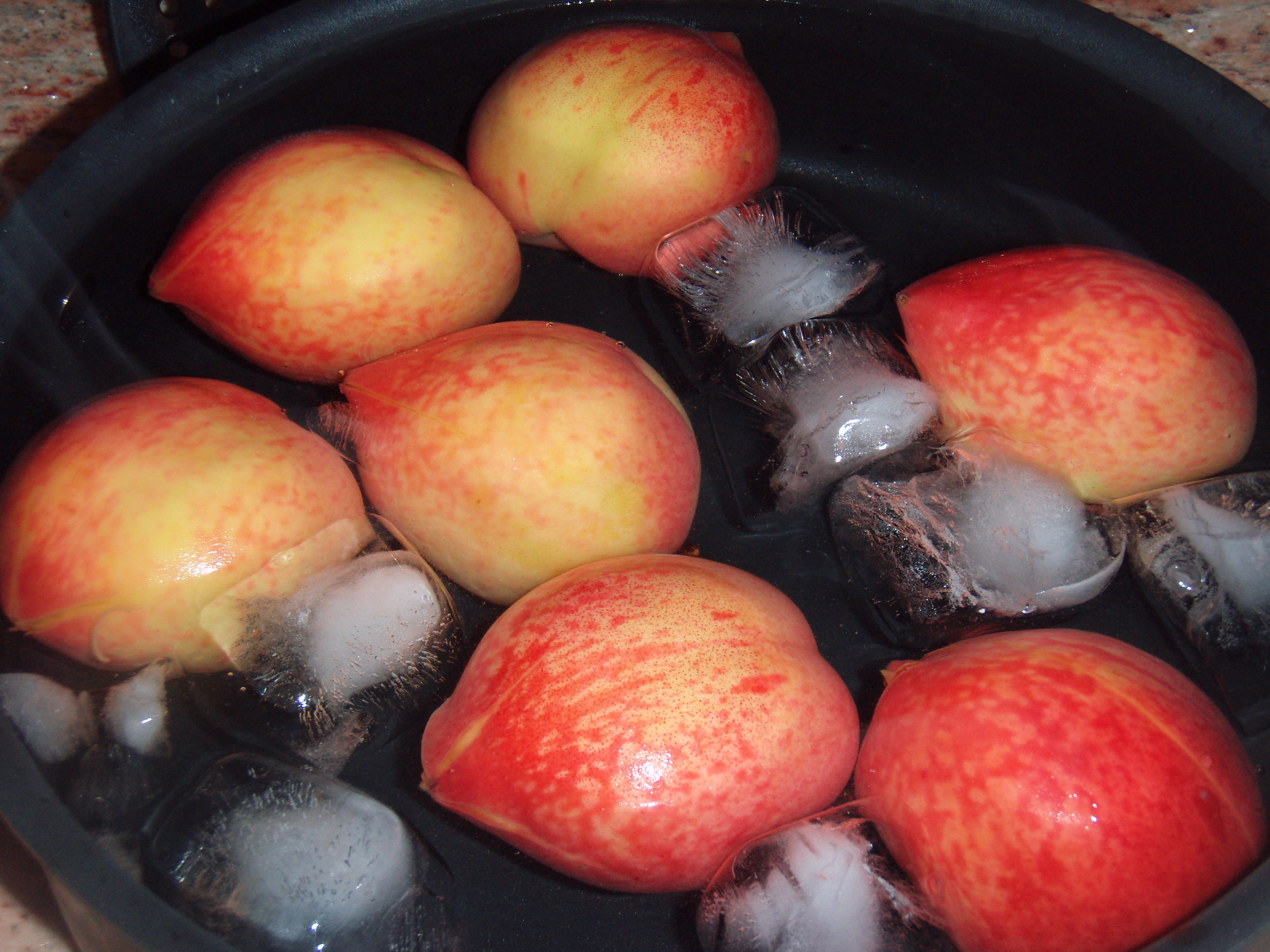 With a slotted spoon, transfer the peaches to an ice bath. Leave them to cool for about 1 minute. Drain the peaches and pat them dry.