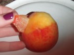 With your fingers and a pairing knife, slip the skin off the peaches.