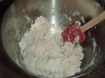 Gradually draw the flour mixture over the water, gathering and combining until the mixture comes together to form the dough. I found that the easiest way to do this is by folding the flour over the liquid. Using a rubber spatula, cut down the middle of the mixture, scoop from underneath, fold the flour on top of the liquid and repeat.