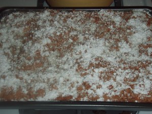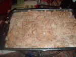 Once the crumb topping is completed and the cake is spread in the cake pan, sprinkle the topping evenly over the batter.