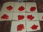 Cut out eight 4-inch squares. If the dough is on the warmer side, place the squares on the prepared baking sheet, cover with plastic wrap and chill for 30min to an hour. Once chilled, place about a tablespoon of the apple raspberry compote in the center of each square.